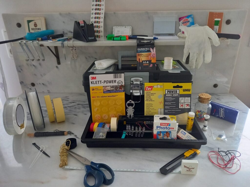 In unserer Konzertbox haben sich nach 25 Jahren einige bewährte (und gerade noch schnell ausgemistete) Dinge gesammelt. Wenn es darum geht, irgendwelche Deko in fremden Räumen anzubringen, schnell noch etwas zu organisieren oder zu beschriften, Kabel am Boden festzumachen – oder das Pedal vom E-Piano, das ständig verrutscht –, dann ist diese Box eine Schatzkiste: