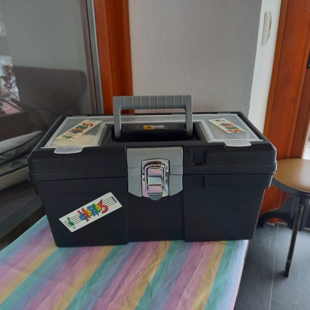 In unserer Konzertbox haben sich nach 25 Jahren einige bewährte (und gerade noch schnell ausgemistete) Dinge gesammelt. Wenn es darum geht, irgendwelche Deko in fremden Räumen anzubringen, schnell noch etwas zu organisieren oder zu beschriften, Kabel am Boden festzumachen – oder das Pedal vom E-Piano, das ständig verrutscht –, dann ist diese Box eine Schatzkiste: